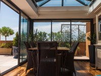 Aménagement d'une véranda qui s'étend sur les deux étages de la maison. A l'intérieur on aperçoit un salon moderne et contemporain avec vue sur le jardin.
