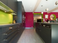 Cuisine aménagement linéaire Les différentes zones de la cuisine sont bien identifiées : Un linéaire de meubles est destiné aux rangements et à la cuisson avec plan de travail Quartz SILESTONE dans lequel sont intégrée une table de cuisson induction et un tepan-yaki les deux surmonté d’une hotte inox et verre. Rangement calculé du solo au plafond avec intégration LED qui apporte un confort lumineux et mette en valeur la crédence verre laqué verte. Aménagement colonne avec combiné four, micro-onde encastré à une haute qui en facilite l’utilisation. Îlot central original aux formes légèrement arrondies, il détermine l’espace de travail l’îlot comporte également une cuve sous plan pour un coin vaisselle. Sur cet îlot, une zone permet de prendre son petit déjeuner, de s’asseoir pour la préparation des repas. Afin d'optimiser les rangements de cette cuisine, nous avons opté pour des rangements toutes hauteurs. Afin de préserver l'environnement naturel dans lequel baigne la cuisine, nous avons choisi un modèle en chêne, teinté gris anthracite pour plus de modernité