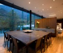 Salle à manger communicante avec le salon, seule un pan de mur permettant la circulation, sépare et délimite les deux pièces. Une grande table à manger carrée en marbre aménage cet espace. © Jorge Taboada