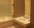 Salle de bain pour une personne,lavabo en faïence blanche. Grand placard de rangement marron.