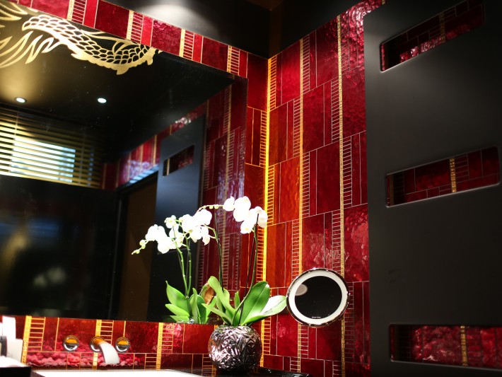 Les dorures sur le carrelage murale ainsi que sur le miroir rappellent le style asiatique de cet intérieur. Le vase dans lequel se trouve les orchidées est design. Un sèche serviette marron accompagne le tout. Crédit photo : Zehnder Group France