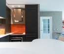 Projet d'agencement et d'ameublement. réalisation d'une cuisine ouverte agencée en U, mobilier finition vison laqué mat Armony Cucine. plan de travail de coran blanc avec coins-repas, crédence en verre laqué Orange HERMES. électroménager encastré et intégré. aménagement de salon avec une composition murale. meuble TV mobiliers Italiens Santarossa