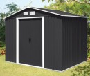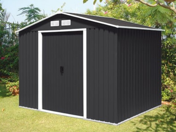 Abri de jardin métallique de couleur anthracite. Il est en panneaux métal et dispose d'une double porte coulissante. © France Abris.