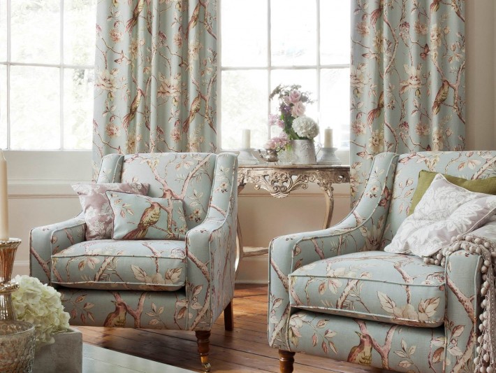 Disposition de deux fauteuils identiques à motifs vintage et floraux. Les rideaux sont assortis aux fauteuils. Des coussins décoratifs viennent accompagner ce décor.