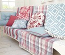 Disposition de quatre tissus à motifs différents : quadrillé, rayée, losange et florale. On retrouve également des coussins décoratifs, certains de couleurs unis, d'autres avec des motifs floraux.