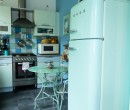 Cuisine avec du mobilier rétro et vintage dont le fameux réfrigérateur italien des années 50. Les couleurs, dans différents tons bleus et verts, sont pétillantes. L'ambiance générale de cet espace est accueillant et jovial !