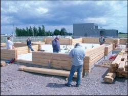 Le bois est acheminé sur le site de production par camion (1) avant d'être débité en madriers. La boulangerie a tout d'abord été fabriquée et assemblée sur place (2). Cela permet de garantir un parfait ajustement des différents éléments. C'est ensuite la livraison qui est organisée. Les madriers ont tous été identifiés et numérotés pour faciliter le montage. Trois camions sont nécessaires et après quelques milliers de kilomètres parcourus, chaque pièce est déchargée et installée au sol, en fonction de sa destination (3). Il est même possible de commander des pièces plus «personnalisées» ! Allez, on passe au montage qui s'effectue sur une dalle béton (4).